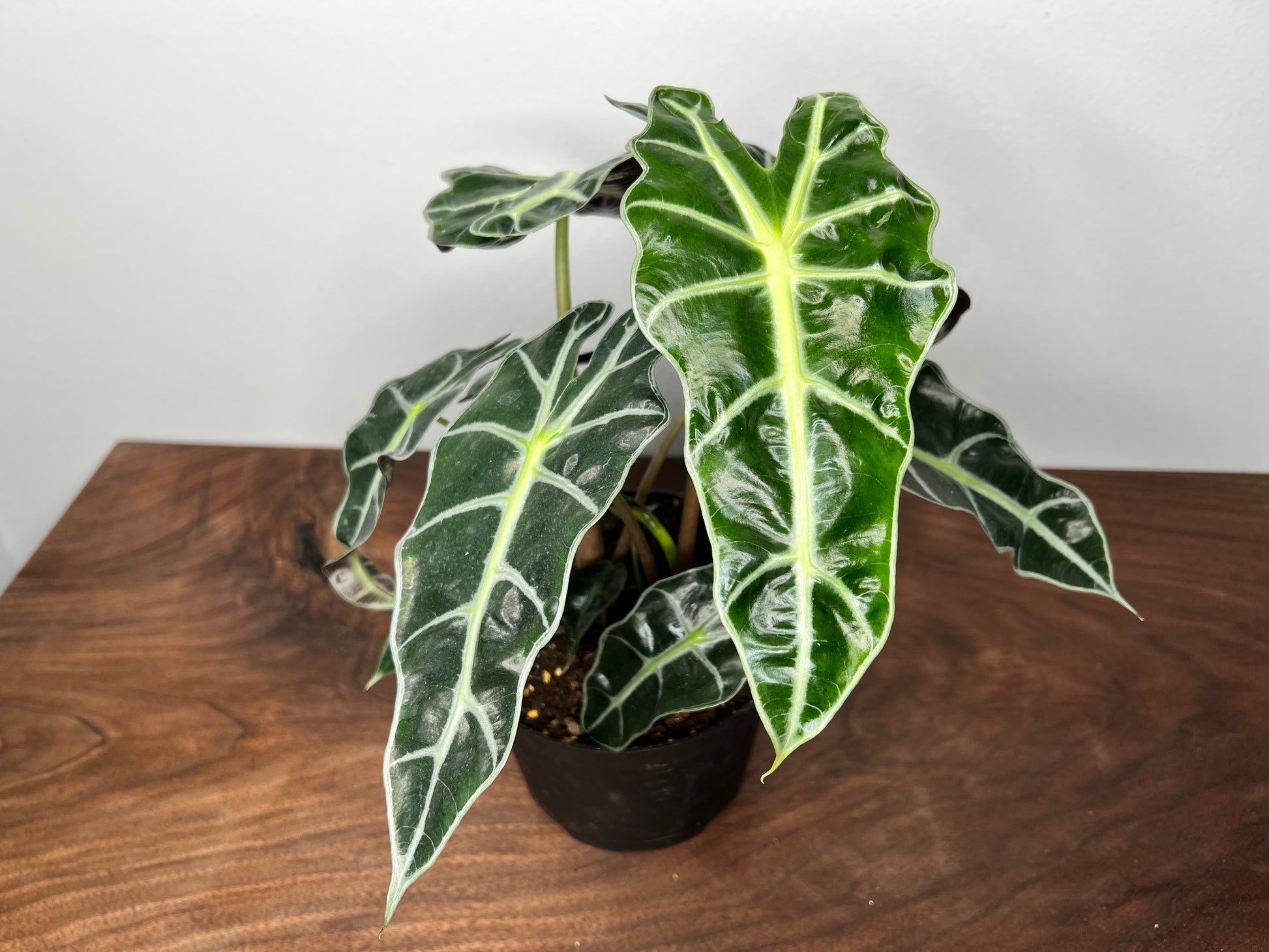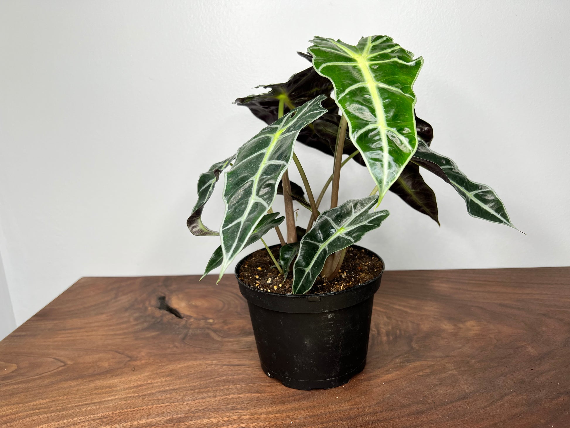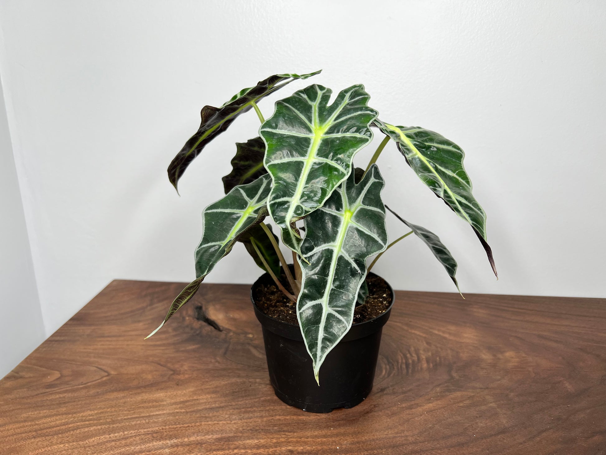 Alocasia, commonly known as elephant's ear, is a striking tropical plant that needs warm, humid conditions, and is usually grown as a houseplant. It is prized for its large heart-shaped or arrow-shaped leaves and the foliage of some varieties has prominent veins or variegation. In the summer, alocasia grows quickly, producing a new leaf every week.