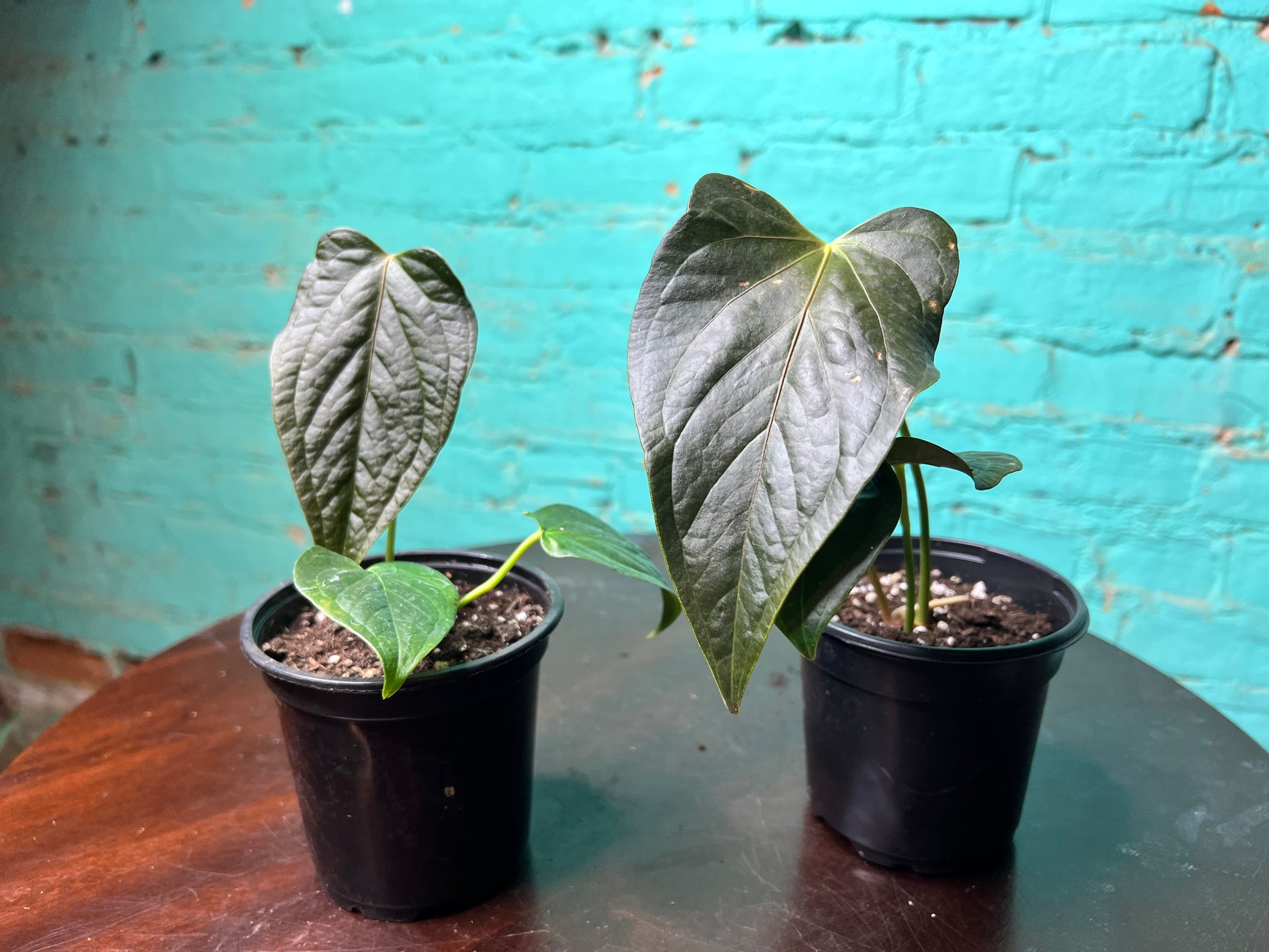 Anthurium ‘Queen of Hearts’, a cultivated hybrid from tropical Central and South American lineage, is known for its large, broad, heart-shaped leaves with a smooth to lightly textured surface and defined veining. What makes this plant special is its classic heart form—wide, symmetrical leaves that feel full and substantial, giving it a bold, romantic, collector-style look compared to longer strap or velvet types.