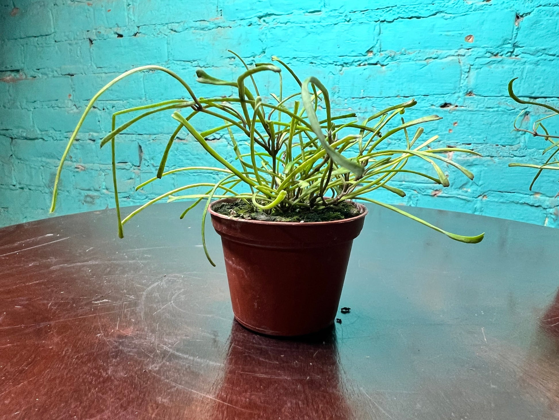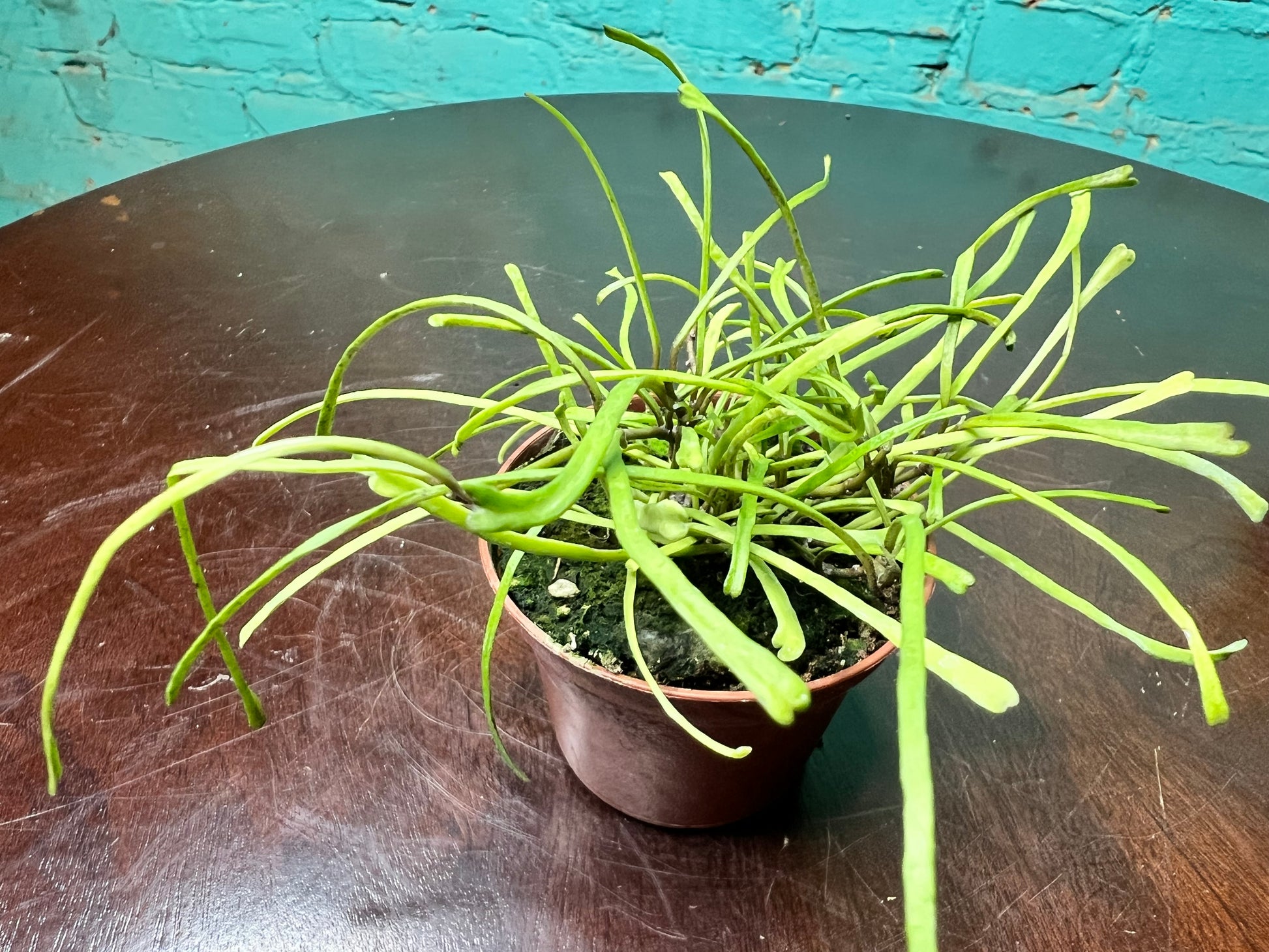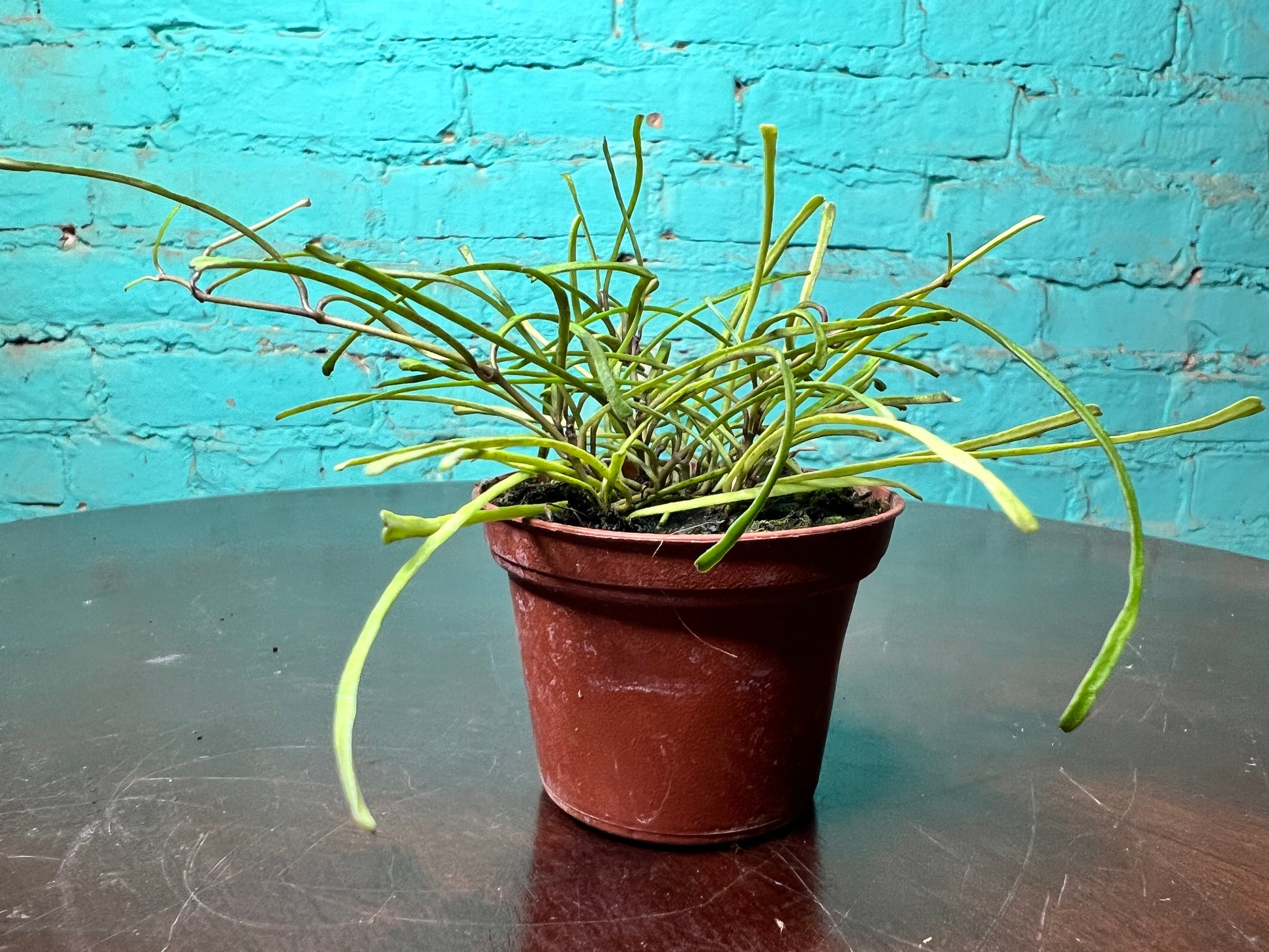 The Hoya ‘Retusa’ is a rare and elegant tropical vine native to Southeast Asia, particularly the Philippines. It is prized for its small, narrow, grass-like leaves that grow densely along trailing stems, giving it a fine-textured, delicate appearance perfect for hanging baskets or elevated display. Its unique foliage creates a soft, cascading effect that contrasts beautifully with broader-leaved Hoyas.