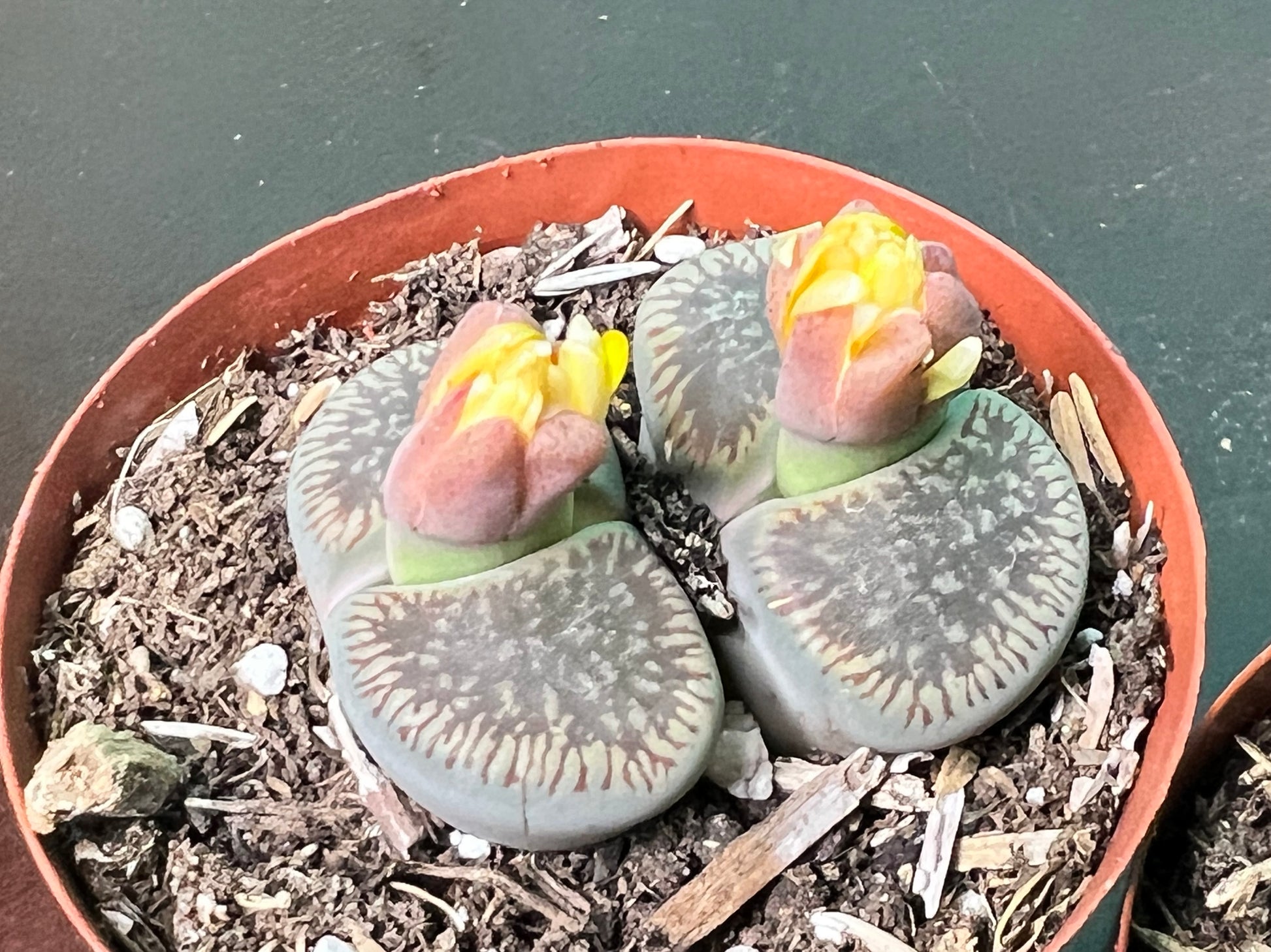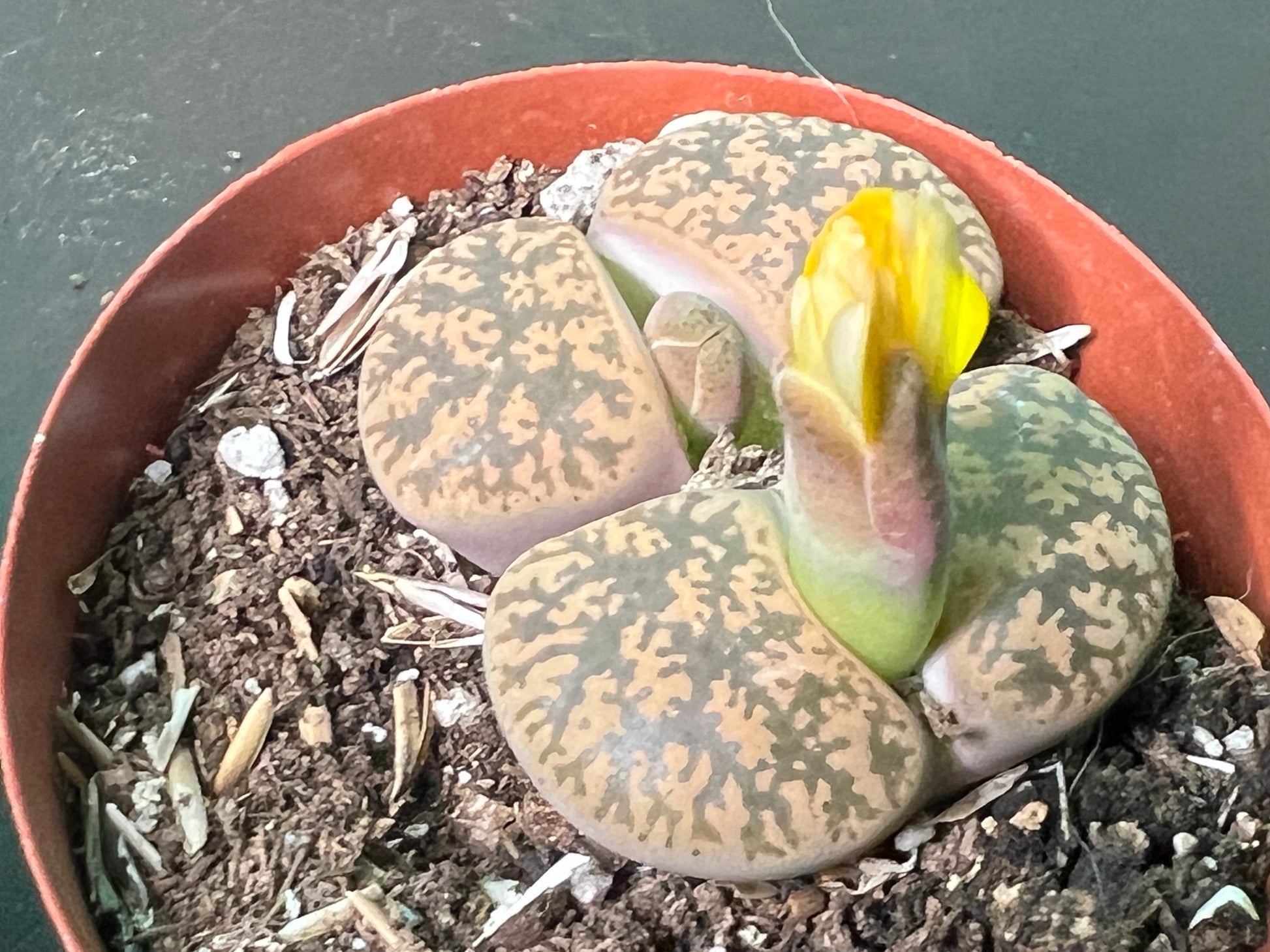 Depending on what living stone plant you have, the flowers will look daisy-like with many petals that are yellow, pale orange, or white. You'll see them peek through the fissure between the leaves. Some living stone blooms have a subtle sweet fragrance, while others do not. The flowers tend to open on sunny days and close up when the sun goes down.