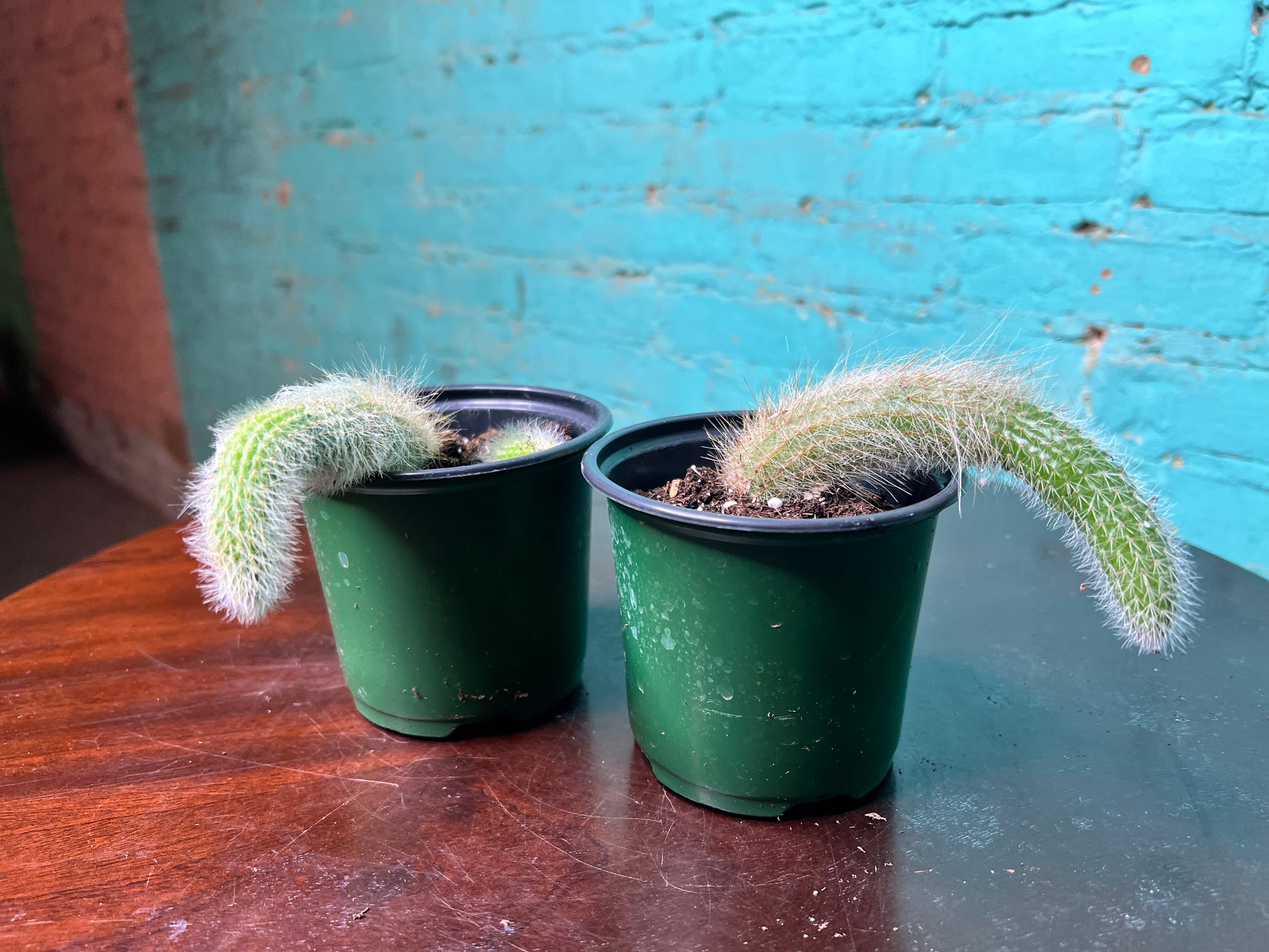 The Monkey Tail Cactus (Cleistocactus colademononis) is a rare and whimsical cactus native to the cloud forests of Bolivia. It’s instantly recognizable for its long, trailing stems covered in soft, fuzzy white spines—earning it the nickname “monkey tail.” In its natural habitat, it grows hanging from cliffs or trees, and in cultivation, it's a showstopper in hanging baskets. As it matures, it produces bright, tubular red-pink flowers that bloom from the sides of the stems, adding a vivid contrast to the soft, silvery spines. These blooms often appear in late spring or summer and can attract pollinators if placed outdoors.