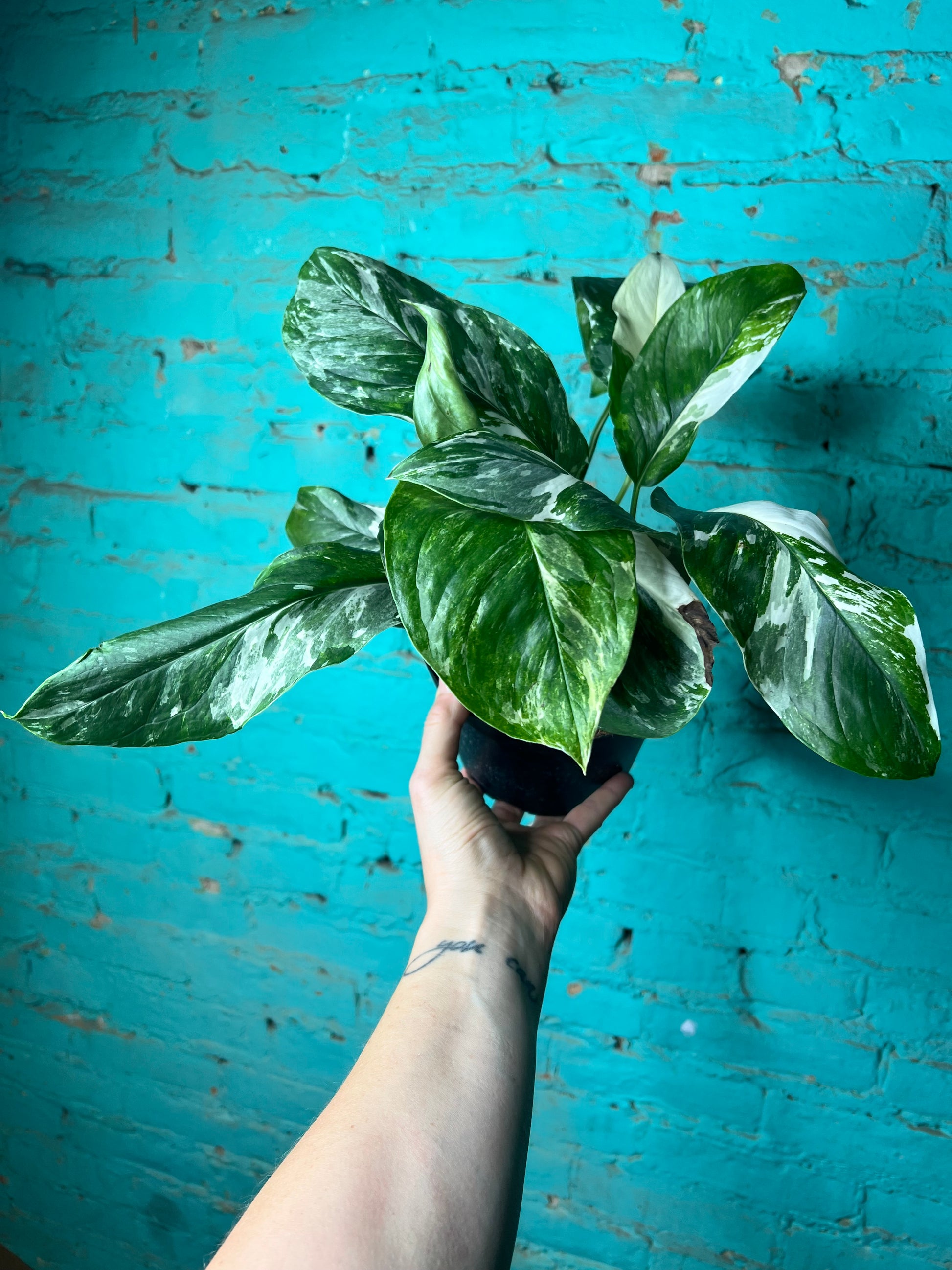 The Monstera lechleriana variegated is a rare and captivating species known for its distinctive fenestrated leaves and beautiful marbled variegation. Native to Central and South America, this climbing aroid thrives in tropical rainforests where it grows along trees, reaching for dappled sunlight filtered through the canopy. The variegation—splashes of creamy white or pale yellow across deep green leaves—adds a striking visual contrast, making it a prized addition to any plant collection. Each leaf is unique, often displaying a blend of marbling, streaks, and speckled patterns that evolve as the plant matures. Leaves range from 6” to 18” at maturity.
