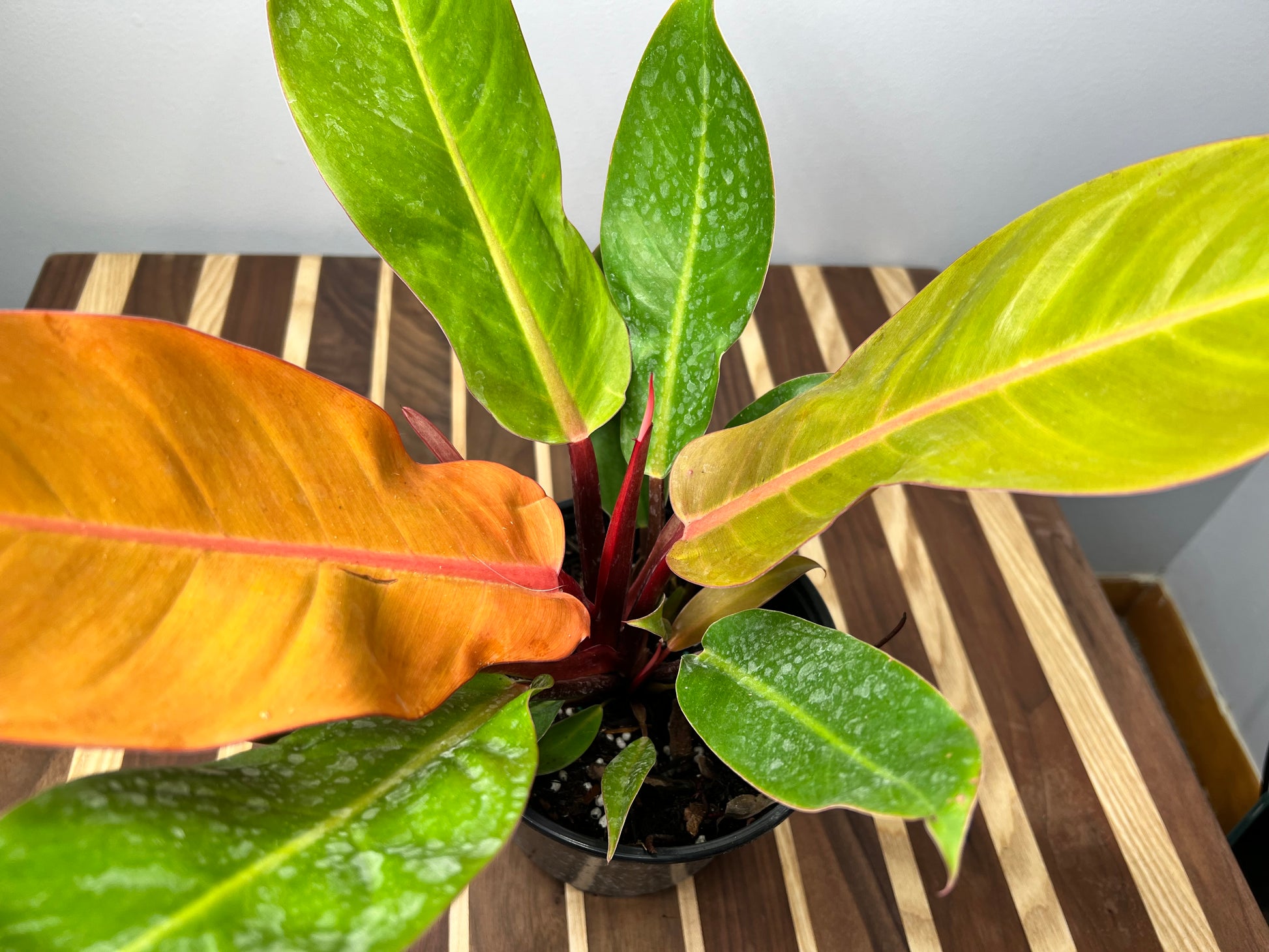 Philodendron Prince of Orange prefers bright indirect sunlight but can live in lower light conditions. When this plant receives less than 5 hours of indirect sunlight each day, its new leaves will emerge smaller, its vines will become leggy, and vibrant colors and variegation may fade! If your home doesn't have bright indirect sunlight, you can use artificial light as a supplement. We recommend LED grow lights turned on for 8-10 hours daily! Read more about indoor plant lighting needs!