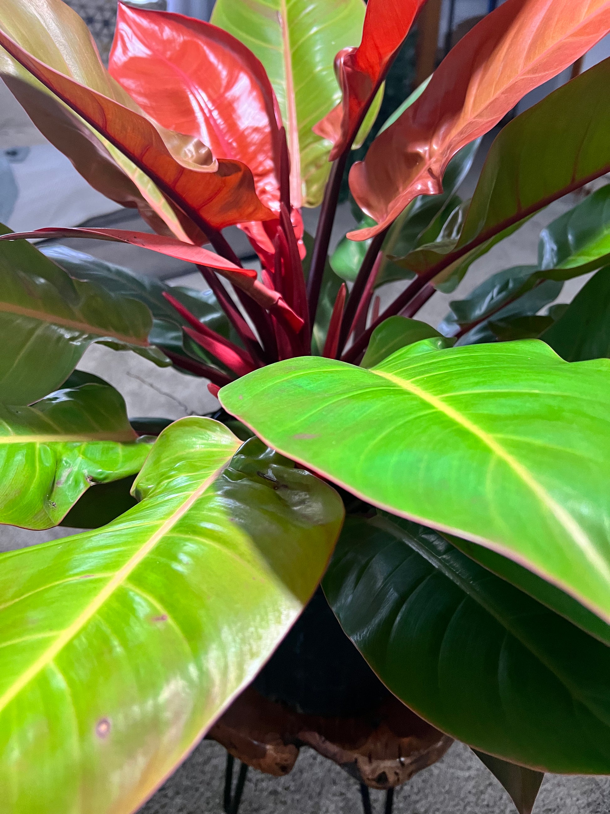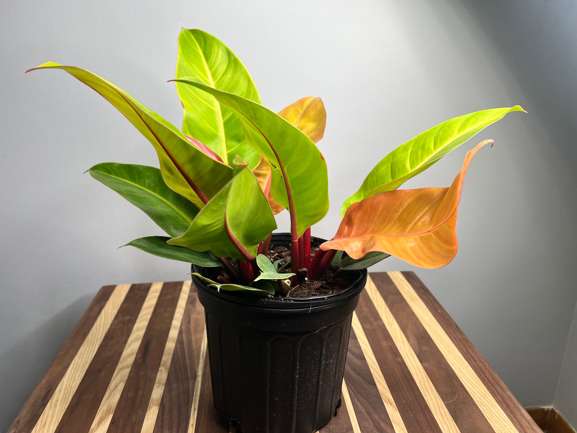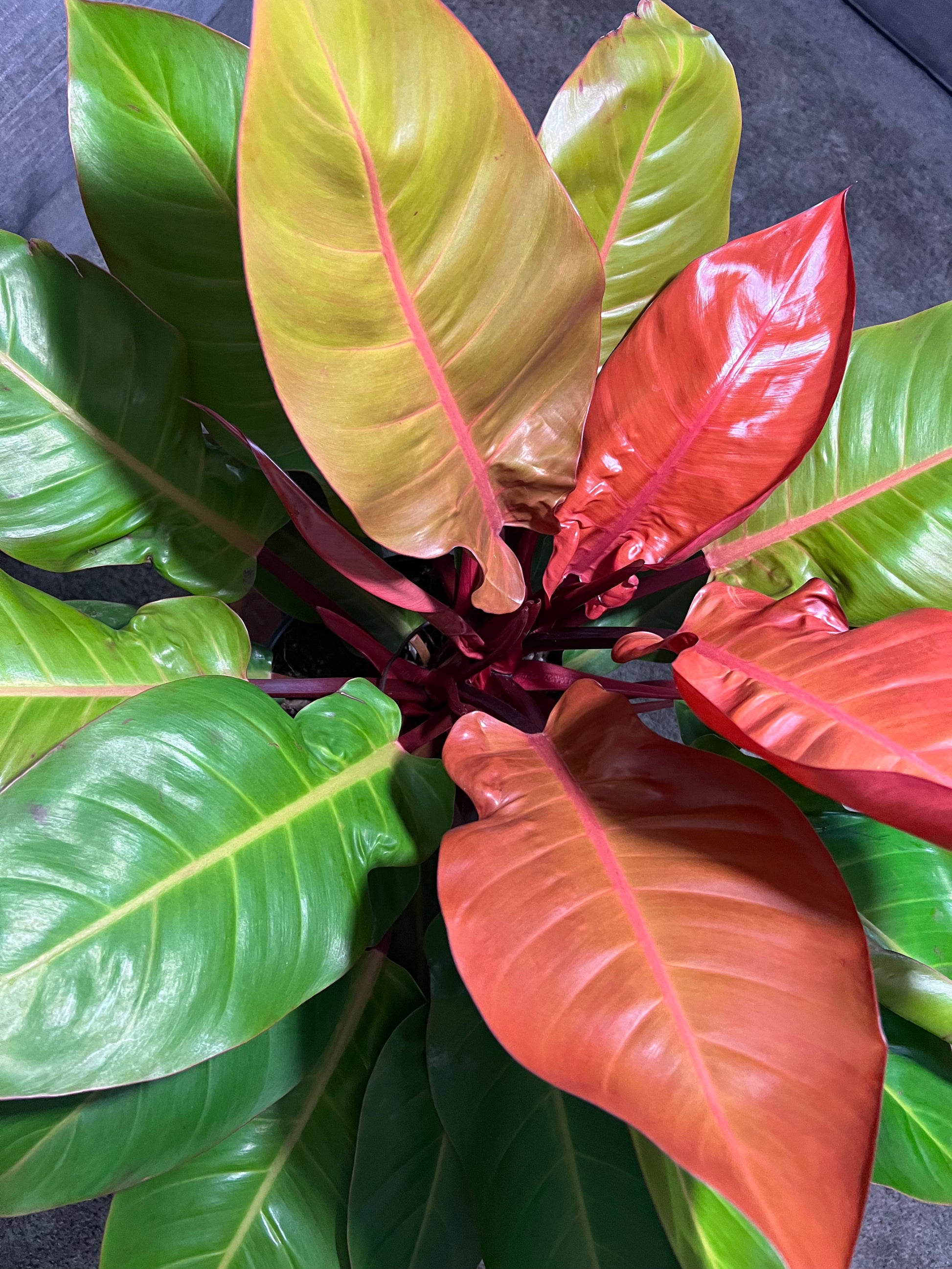 The 'Prince of Orange' is a striking cultivar of Philodendron, prized for its vivid, color-shifting foliage. Originating from tropical rainforests in South America, particularly Brazil, this hybrid variety was bred for its ornamental value and is not found in the wild. New leaves emerge a vibrant copper-orange, gradually maturing to chartreuse and deep green, giving the plant a dynamic, multi-colored appearance. Its compact growth habit and eye-catching color make it a popular choice for indoor plant enthusiasts and collectors.