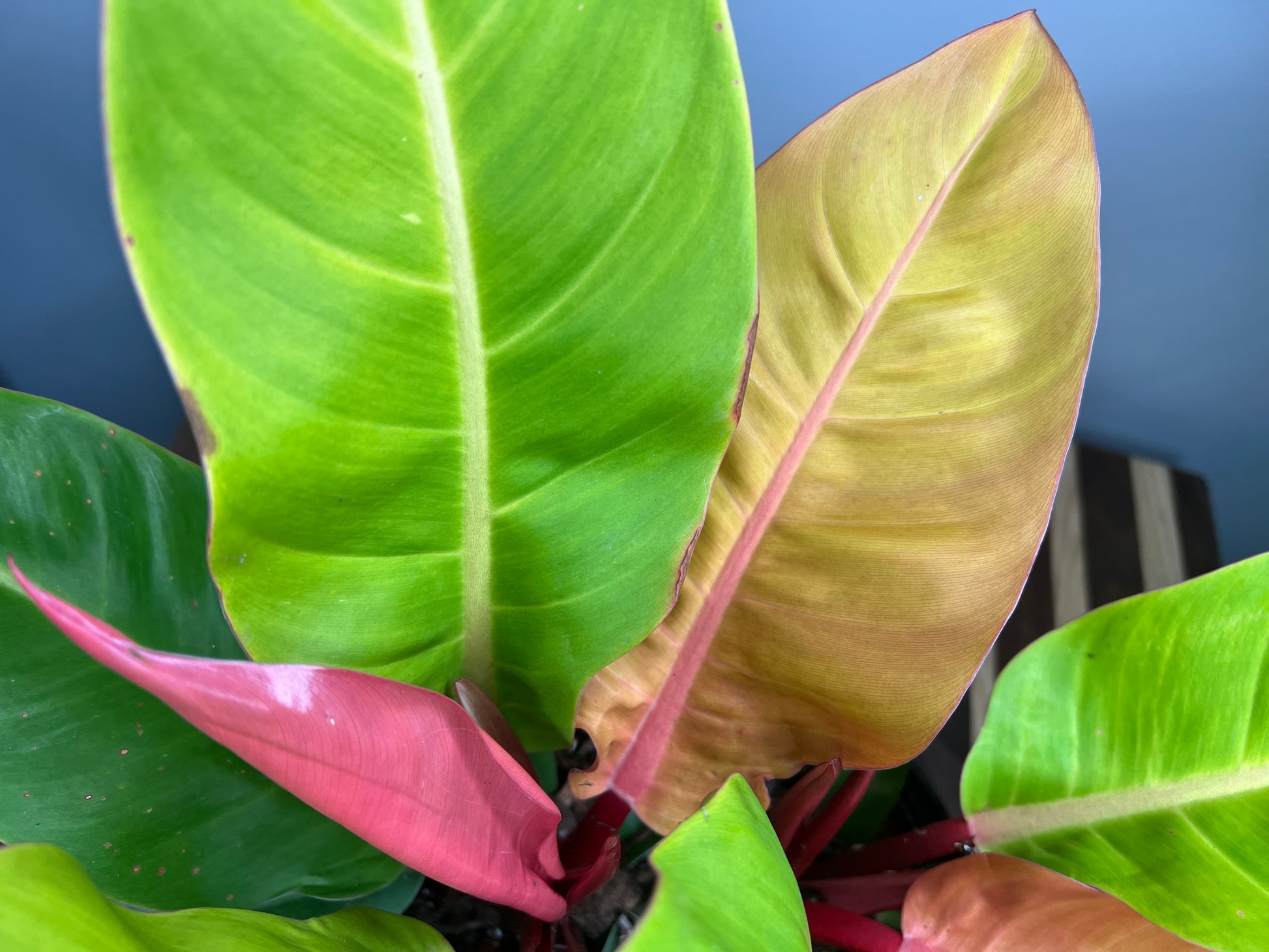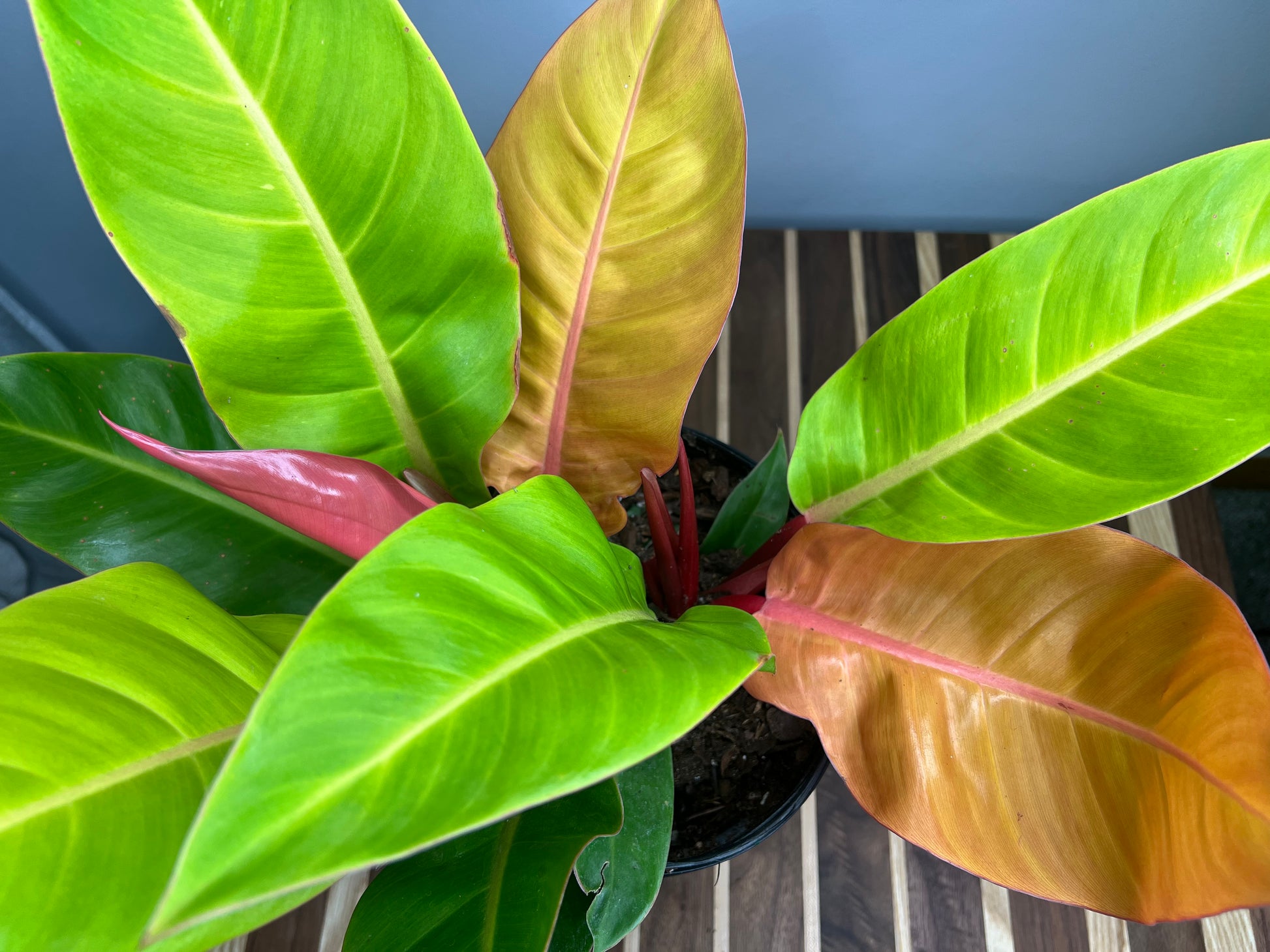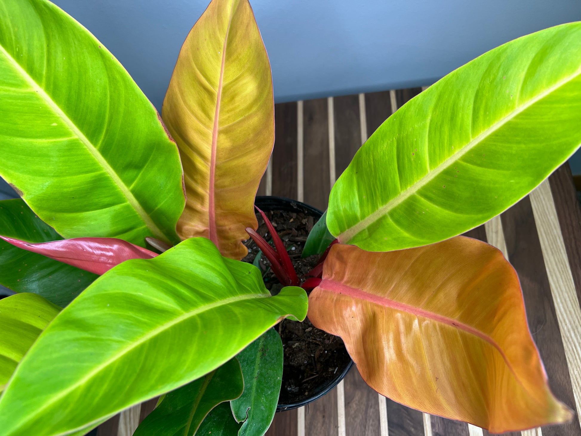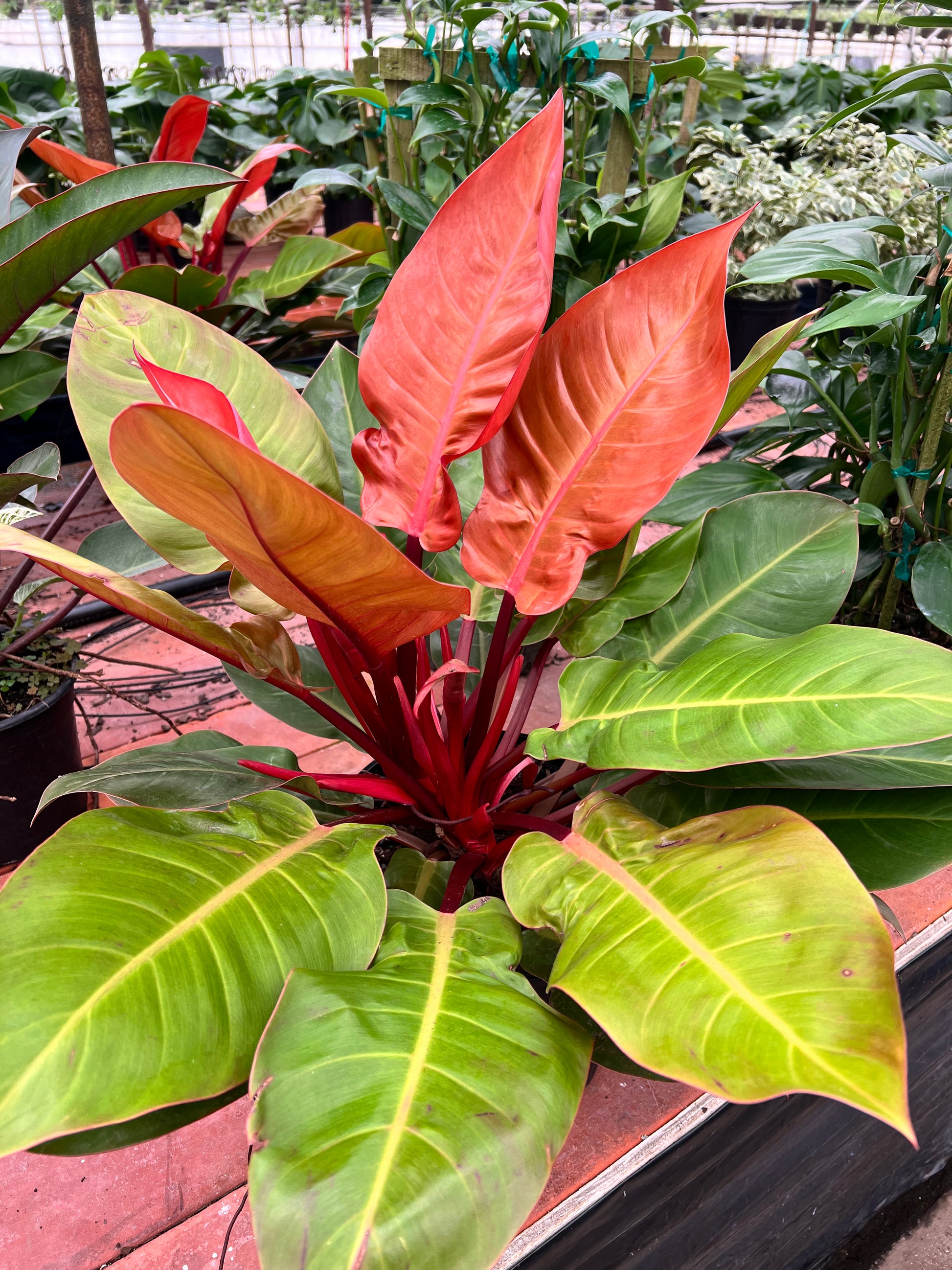 The 'Prince of Orange' is a striking cultivar of Philodendron, prized for its vivid, color-shifting foliage. Originating from tropical rainforests in South America, particularly Brazil, this hybrid variety was bred for its ornamental value and is not found in the wild. New leaves emerge a vibrant copper-orange, gradually maturing to chartreuse and deep green, giving the plant a dynamic, multi-colored appearance. Its compact growth habit and eye-catching color make it a popular choice for indoor plant enthusiasts and collectors.