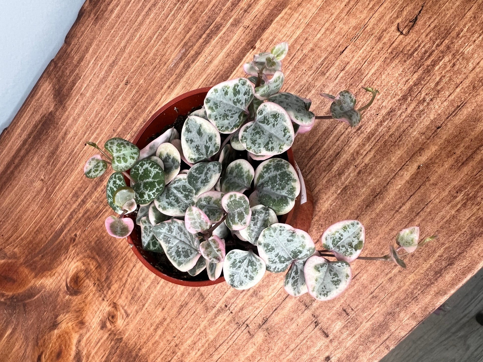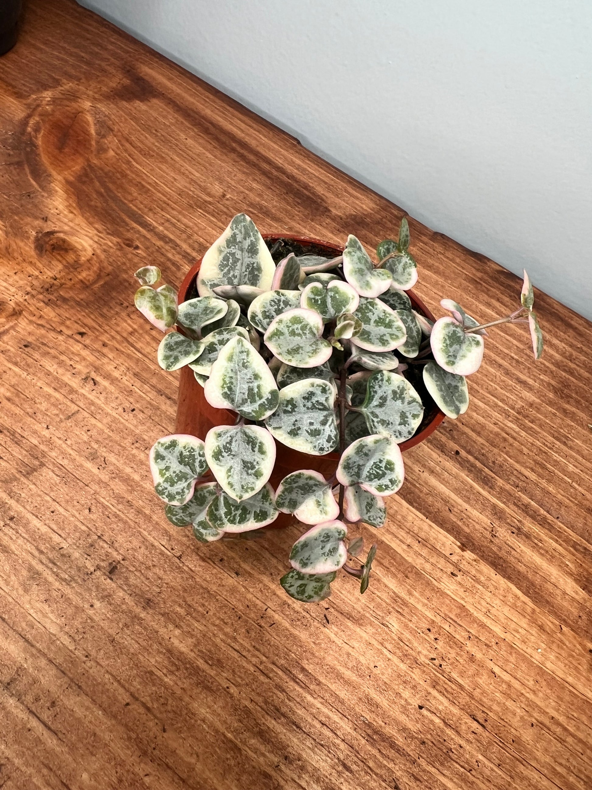 The string of hearts plant is a popular trailing succulent that has heart-shaped pale green leaves with silvery edges. The vines can grow quite long and can be trimmed regularly to keep them looking neat. Avoid overwatering as this may causes leaves to turn yellow or drop off.